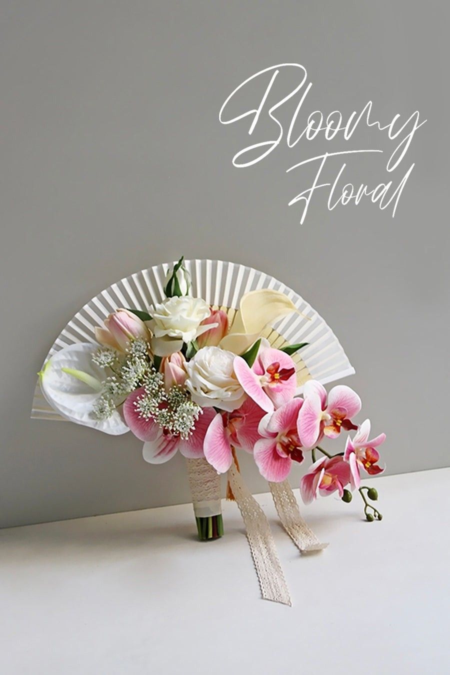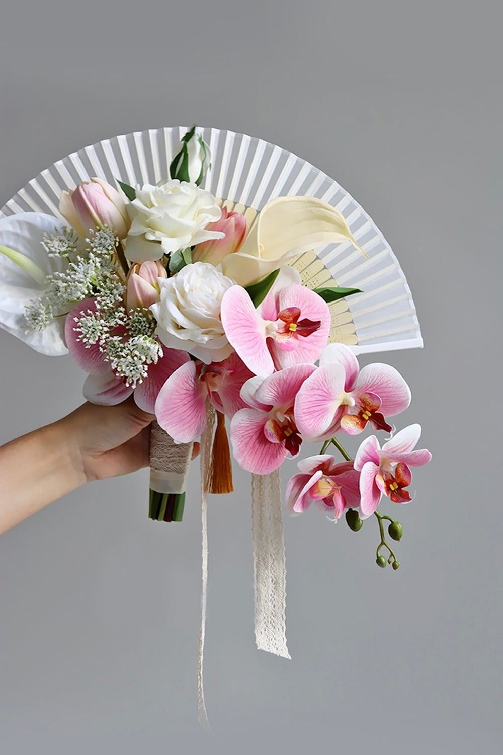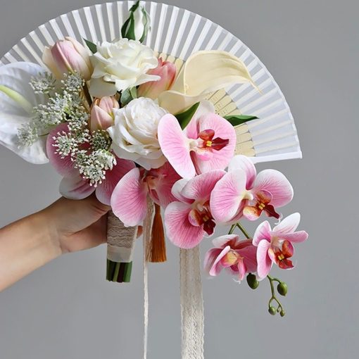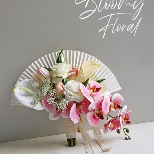 Điểm nhấn của bó quạt nơ nằm ở sự phối hợp cân đối giữa quạt và hoa. Những cánh hoa lan hồ điệp mềm mại đổ rũ xuống tạo hiệu ứng uyển chuyển, trong khi hoa hồng và tulip hồng – trắng giúp tạo độ đầy đặn, mềm mại và nữ tính. Hoa calla trắng và baby li ti được thêm vào để tạo điểm sáng, tăng chiều sâu và mang đến sự nhẹ nhàng cho tổng thể bó hoa.